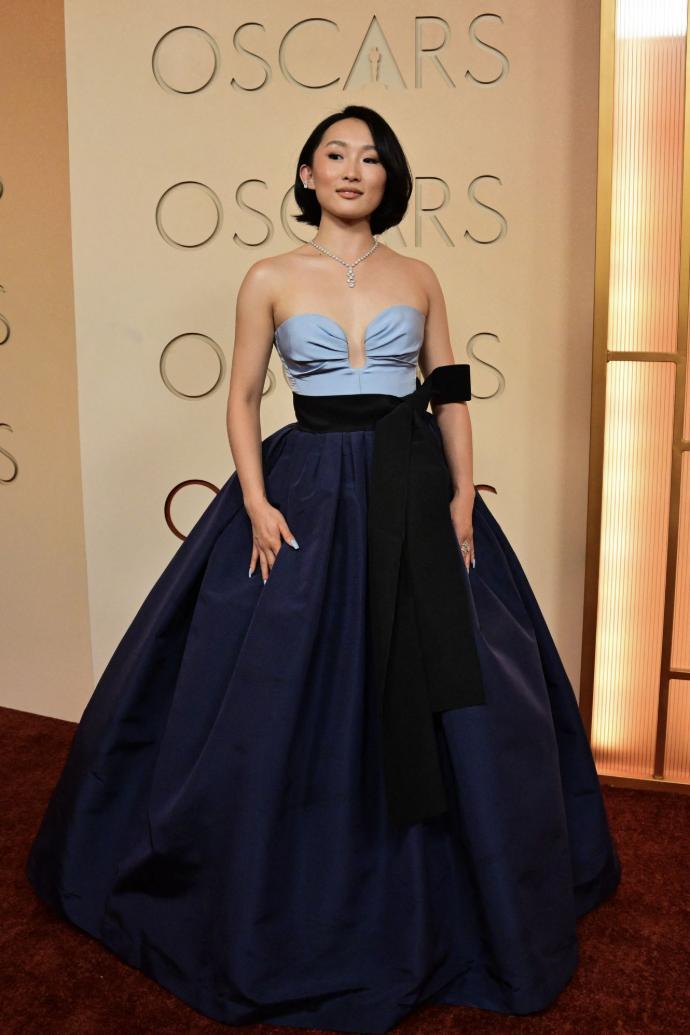 Ji-Young Yoo una de las revelaciones de esta gala opto por un vestido de vanguardia coreana con una mezcla de alta costura parisina Miu Miu, una firma que ha apostado fuertemente por ella en este último año haciendo que resaltar como un icono de la nueva guardia de Hollywood.